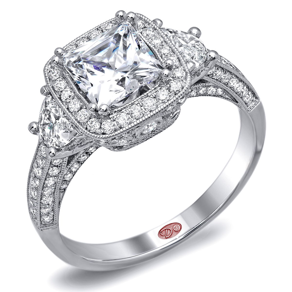 Cathedral setting three-stone square halo engagement ring featuring prong-set halfmoon diamond side stones and pavé-set round diamonds set halfway down the shank with milgrain edging.