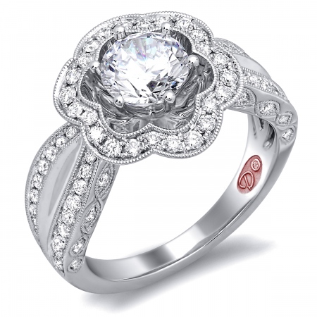 Cathedral setting tapered shoulder floral round halo engagement ring featuring pavé-set round diamonds set halfway down the shank with milgrain edging.