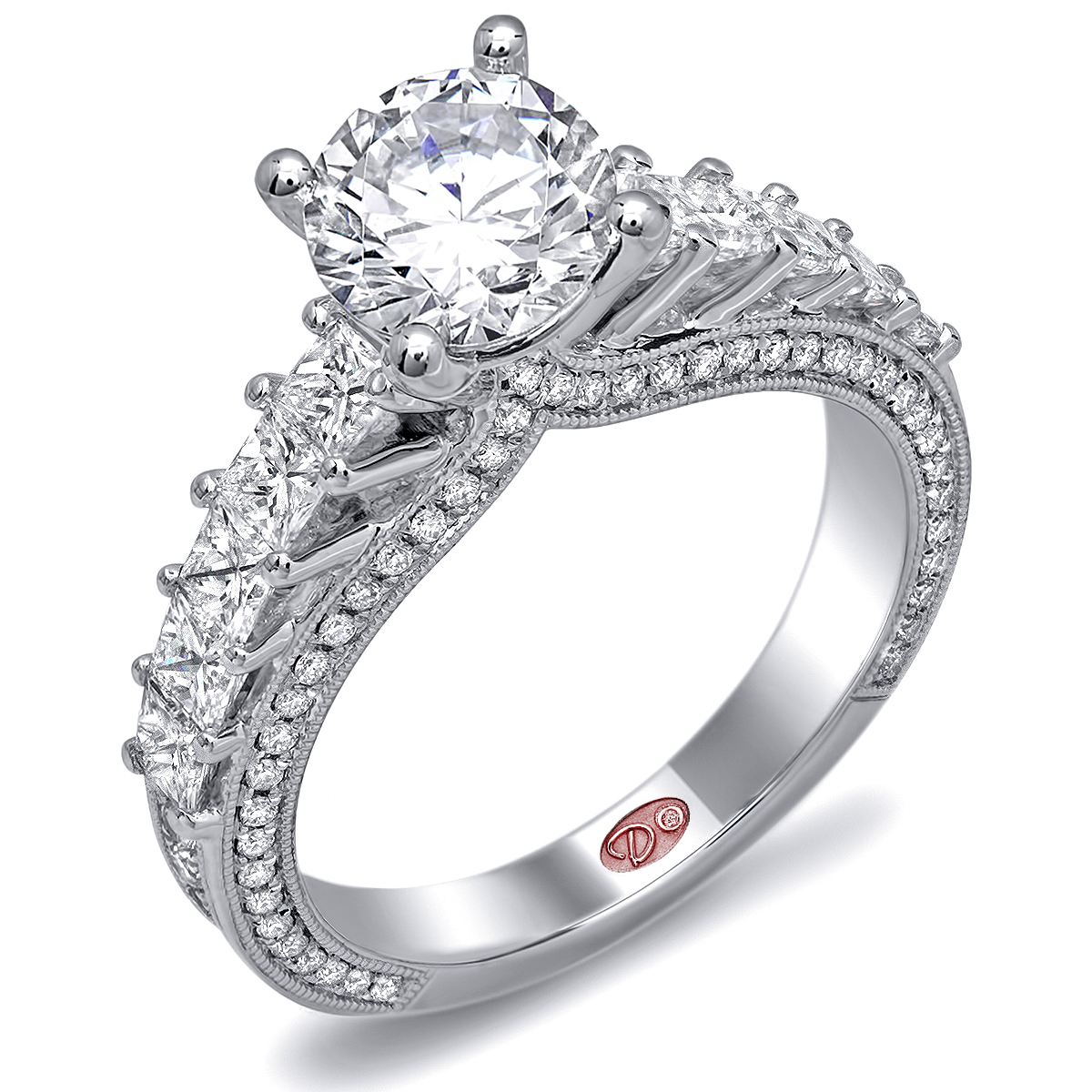 Cathedral setting engagement ring featuring prong-set princess-cut diamonds and pavé-set round diamonds set 3/4 down the shank with milgrain edging.